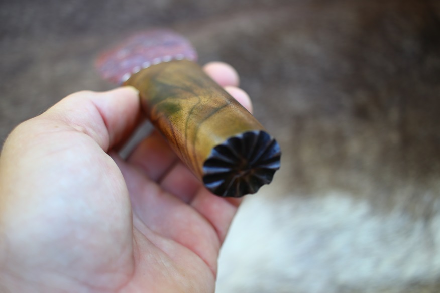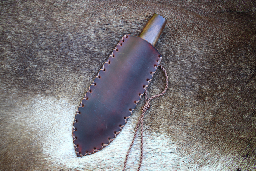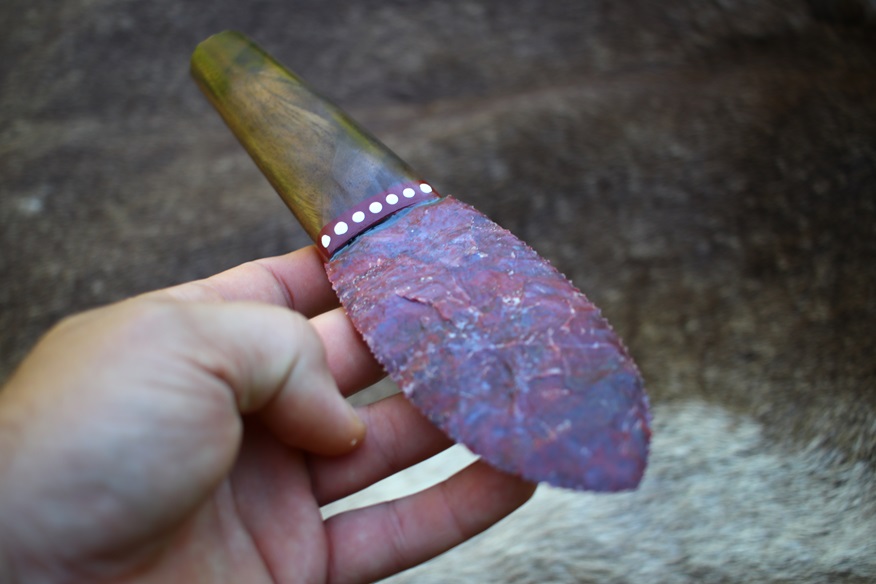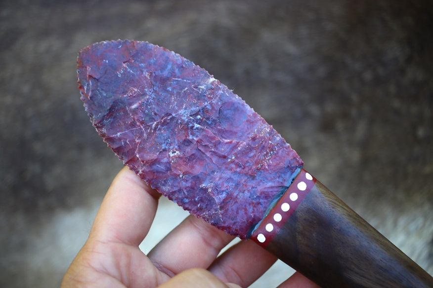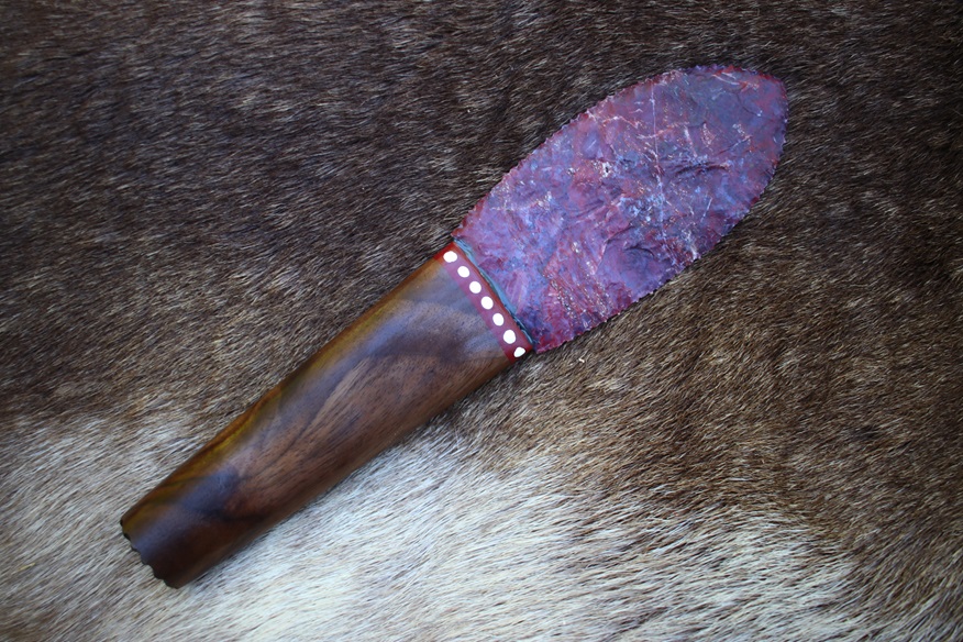 This specialty knife is a tanged Agate blade set into a Black Walnut handle. It is 9″ long overall and comes with a sheath. The blade is knapped from a spall of Indian Agate and has beautiful color patterning. It’s in the classic “Bull Tongue” shape, which is excellent for skinning! It’s sharp and stout, ready to use and display. The knife you see is the exact one you will get!