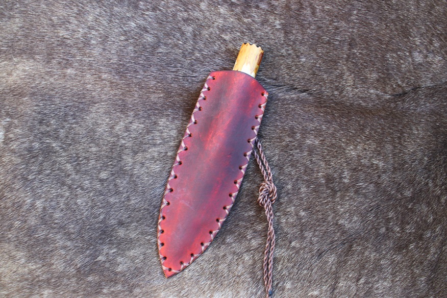 Quiver finishing knife as seen on the HuntPrimitive YouTube Channel (photos lower on this page). A sheath is included with the knife and is designed to tie onto your quiver and be used to finish off game as needed, or do general knife work. This design is long and slender, approximately 8 -8.5″ long, purpose-built for a vitals plunge to quickly dispatch spined or incapacitated animals while on the primitive hunt.