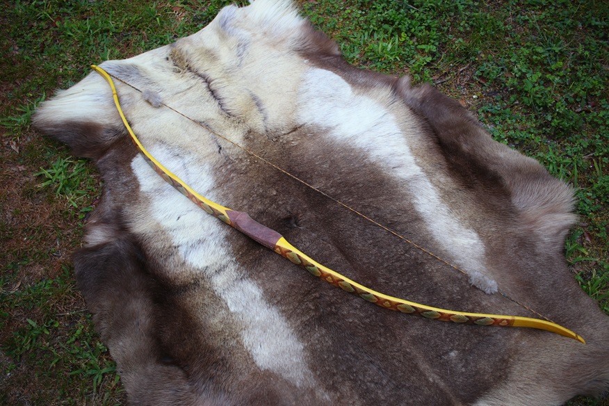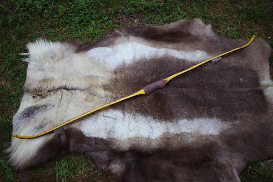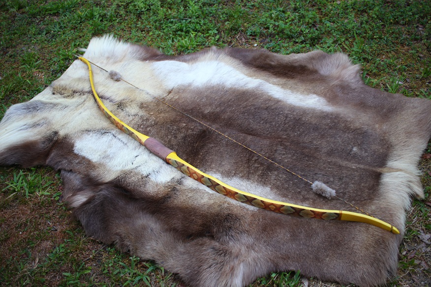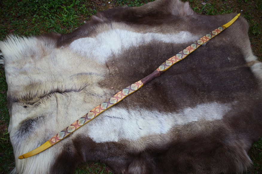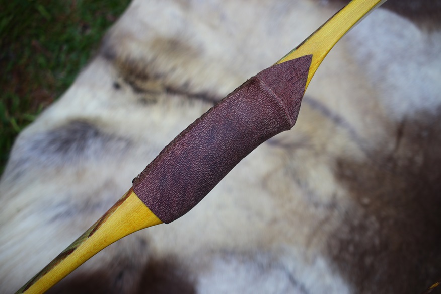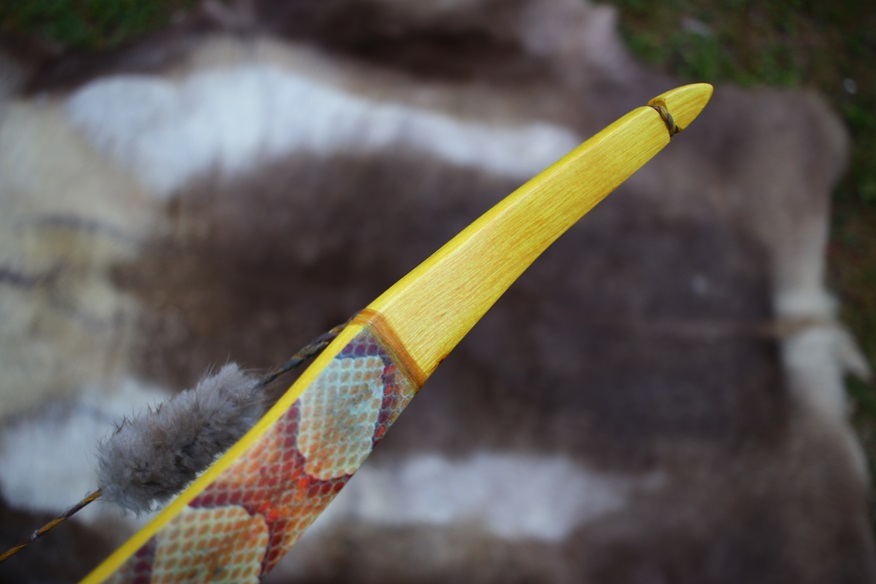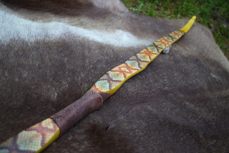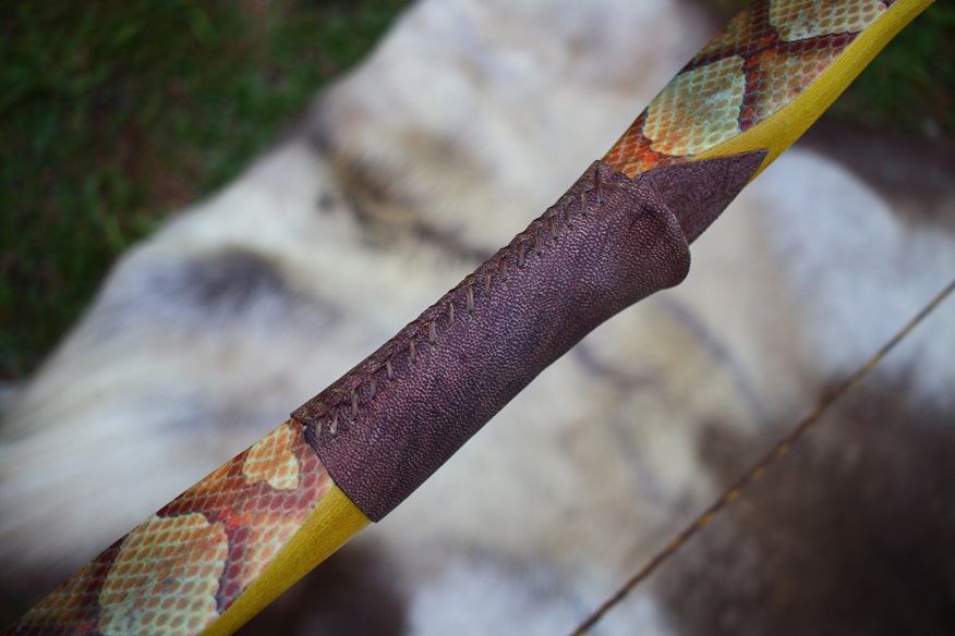 Osage Bow  #461 is in our Classic reflexed-selfbow design. Since copperhead skins are getting very hard to find these days, this one is backed with the artificial copperhead skins, and they came out silky smooth and beautiful. It has a slightly contoured handle and arrow shelf for a right handed archer. It has a deer skin stitched handle and a B-55 string.. It is about 63″ long and pulls 46# @ 28″ (not to be drawn further than 28″. It is an excellent hunting bow that is in-stock and ready to ship.  It comes with our standard (non-custom) 2 year warranty.
