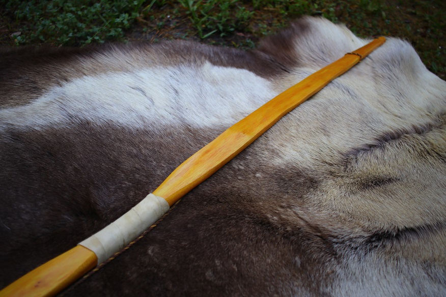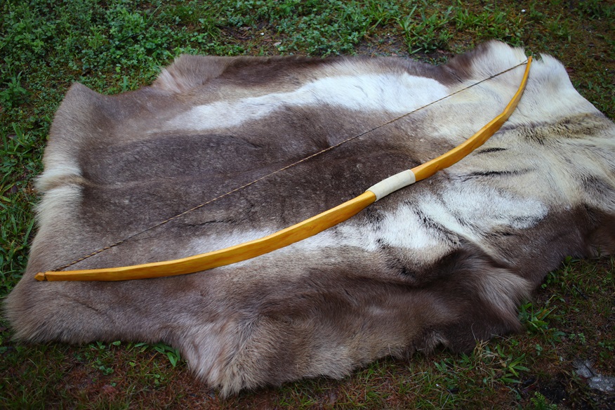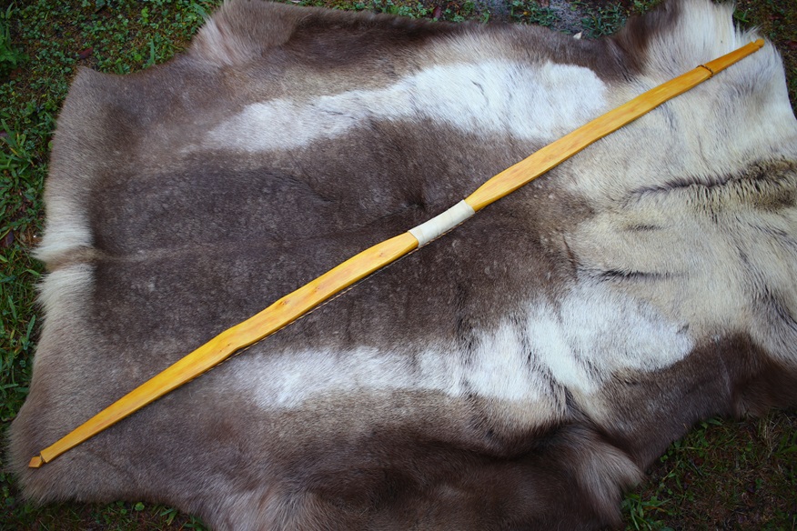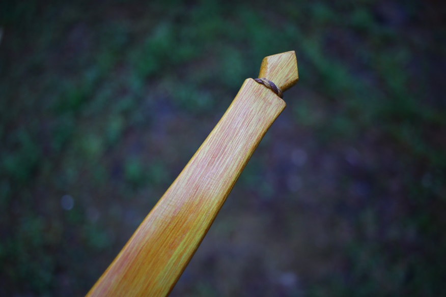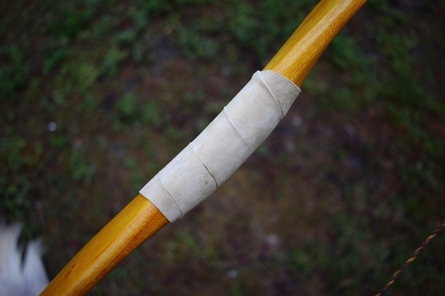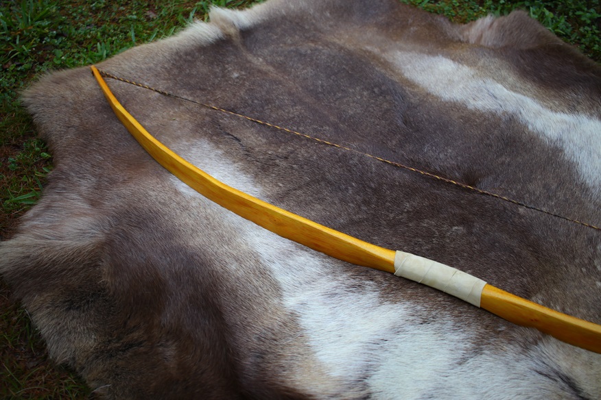 Bow #460 is a made from a solid piece of Osage wood in the classic Eastern Woodland (Cherokee inspired) design. It is built for a right handed shooter and is about 64″ long nock to nock, and pulls 45# @ 27″ (not to be drawn further than 27″). It has a leather wrapped grip designed to be shot off-knuckle, diamond shaped nocks, and a B-55 bow string. It’s a really nice piece of wood with just a touch of natural character with wiggles and knots. It’s a beautifully simple, reliable, reliable hunting bow, ready to ship!