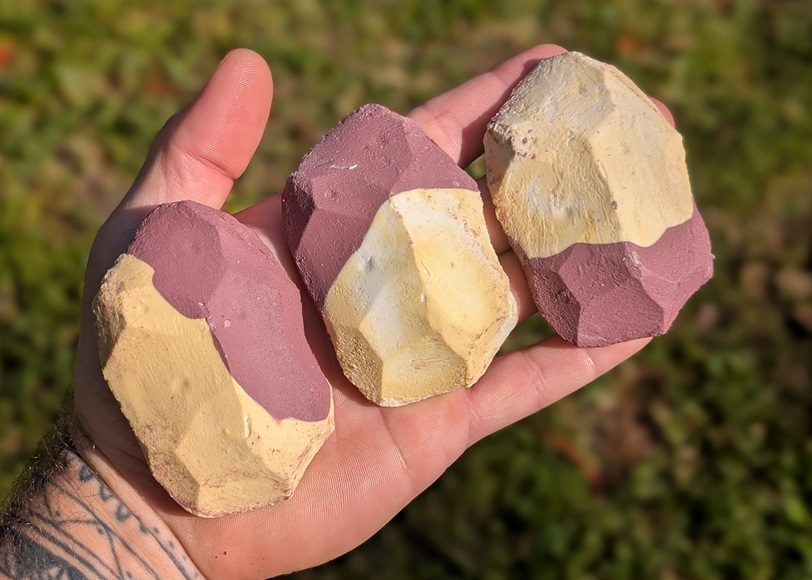 Mookaite Jasper comes from Western Australia near Mooka Creek. It is known for its exceptionally beautiful reds, yellows, and white. The photo below shows one of our new spalls of Mookaite next to a point made from KnapEasy, and the Clovis point on the far right is knapped from original Mookaite. These “hard-lined” colored spalls take considerably more time to make so they are slightly more expensive, but when they are gone they are gone. We won’t be offering this color again until possible next year.