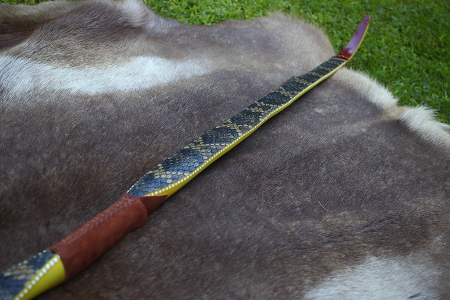 Osage 465 is in our HighPlains configuration with Eastern Diamondback rattlesnake skins and our signature red tips and white dot work. It is set up for a right-handed shooter, approximately 66″ long and 60# @ 28″ (not to be drawn further than 28″). It has a brown deerskin grip and beaver fur silencers.