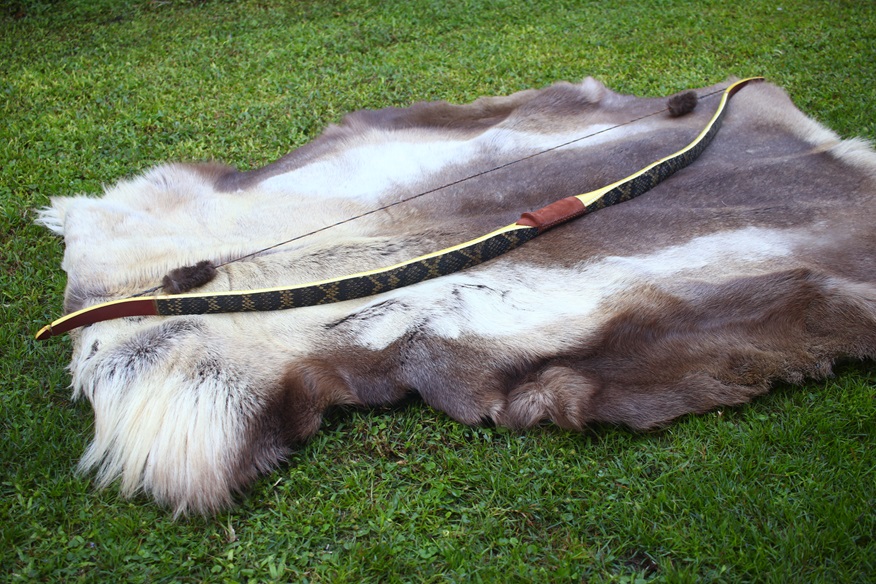 The Primitive High Plains features the classic HuntPrimitive Gullwing shape for superior performance, veneered with Snake skins, red painted tips, white edged dot work, a genuine Braintan wrapped grip with no arrow shelf. The string is a Sinew-colored Dacron (fast flight strings not approved for bows without tip overlays) bow string, primitive twisted, tied and wrapped along the bottom tip. (No fur silencer needed) This version makes for a very primitive, yet very beautiful and long lasting efficient bow. The Primitive version of this bow also comes with a genuine Sinew bow string so you can choose between shooting modern or a true primitive string at your leisure with the Primitive version of this model.