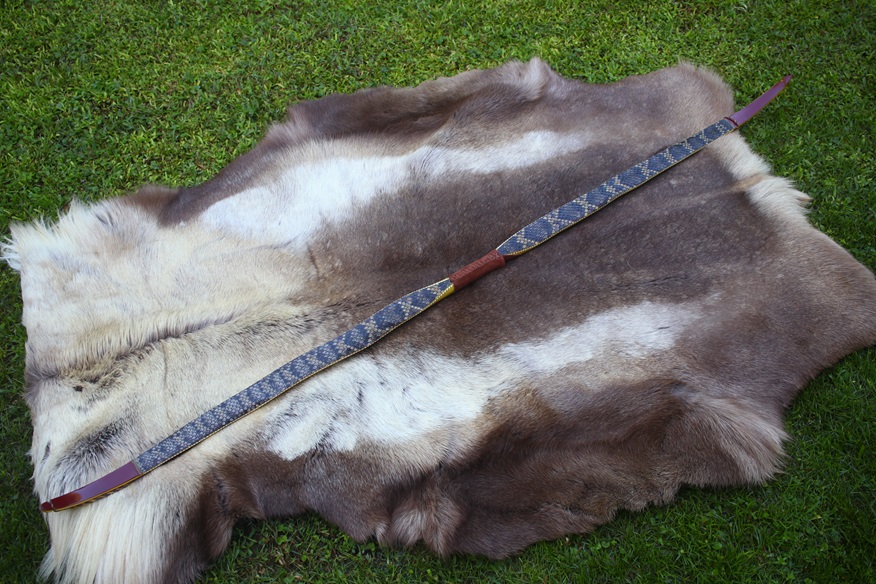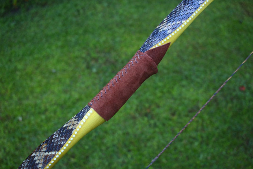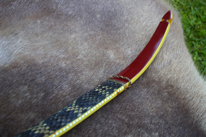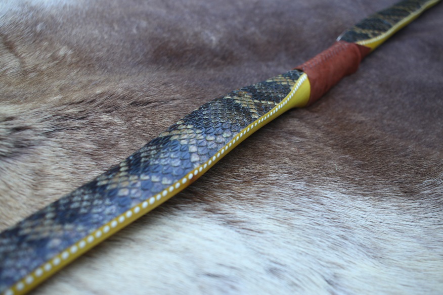 The Modern High Plains model features the classic Osage Hunter shape for superior performance, veneered with Snake skins of your choice. The tips are overlaid with Black Bison horn or Deer antler, and the grip has an arrowshelf and wrapped in beautiful Black/Brown Beavertail leather. The D97/Fastflight String is also fit with beaver fur silencers to dampen the string twang of the flemish style string. It also includes our signature HuntPrimitive Paint scheme of crimson painted tips and white edge dot work