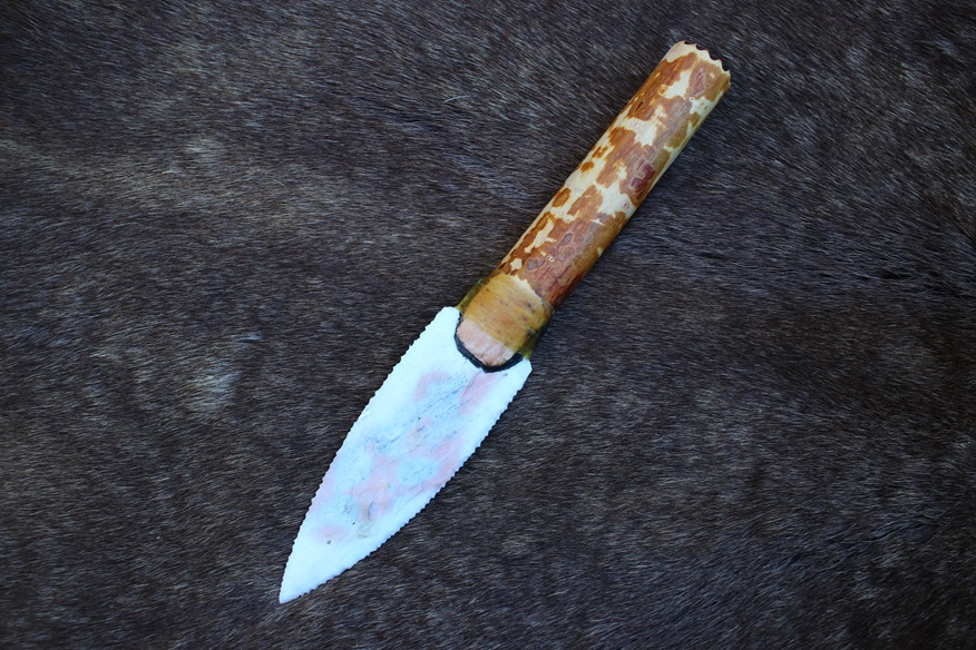 Quiver finishing knife as seen on the HuntPrimitive YouTube Channel (photos lower on this page). A sheath is included with the knife and is designed to tie onto your quiver and be used to finish off game as needed, or do general knife work. This design is long and slender, approximately 8 -8.5″ long, purpose-built for a vitals plunge to quickly dispatch spined or incapacitated animals while on the primitive hunt.